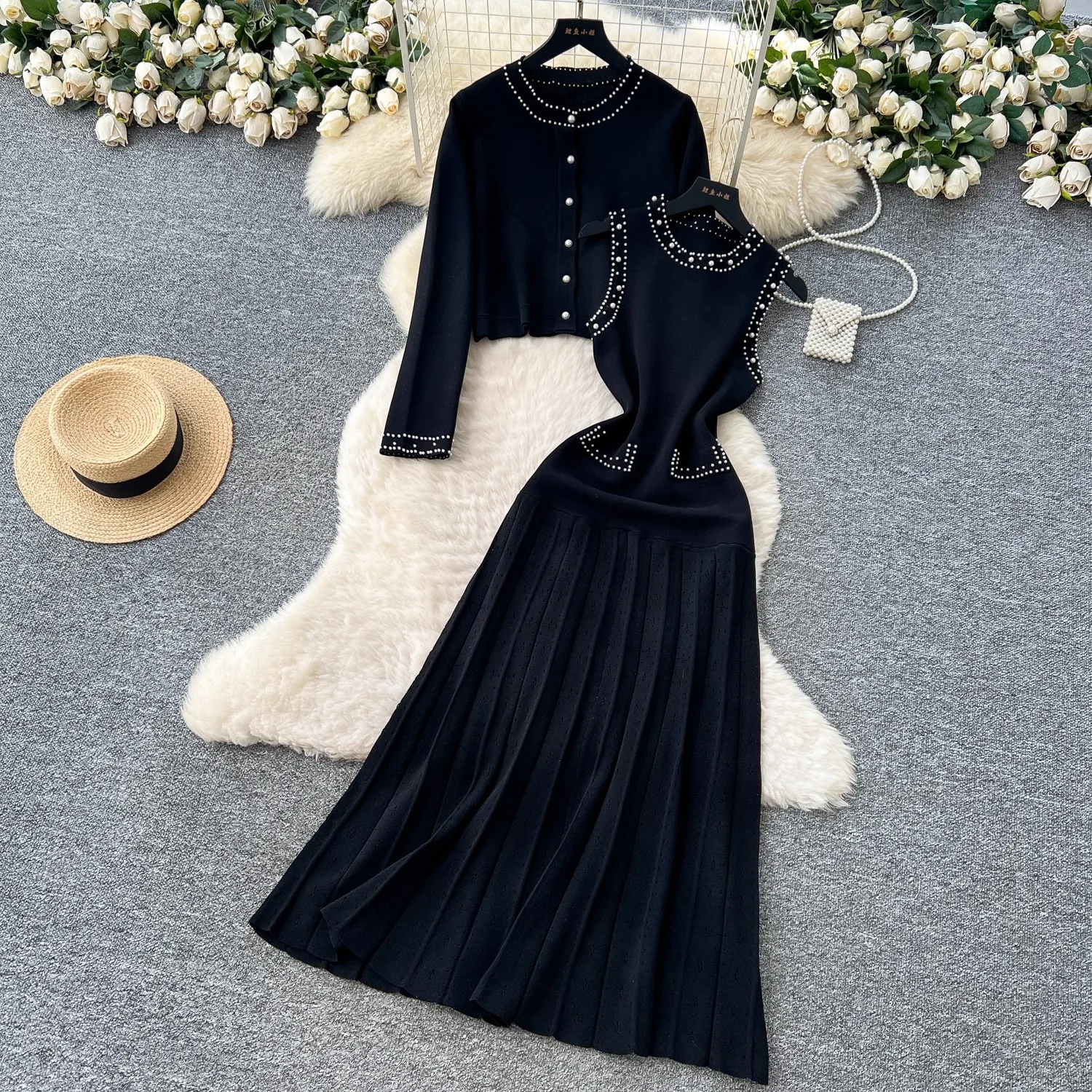 YuooMuoo Brand Fashion Women Two Piece Dress Set 2025 Autumn Winter Luxury Pears Long Fancy Dresses and Long Sleeve Cardigans